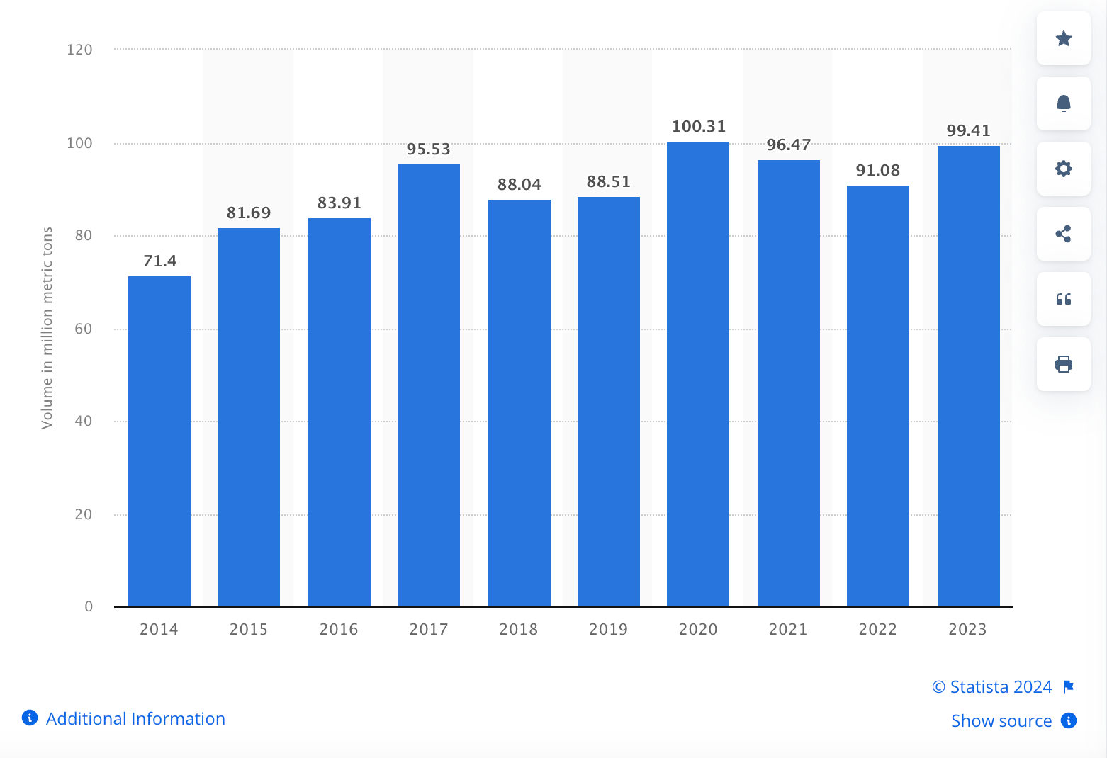 Chart: Import volume of soybeans in China from 2014 to 2023(in million metric tons)