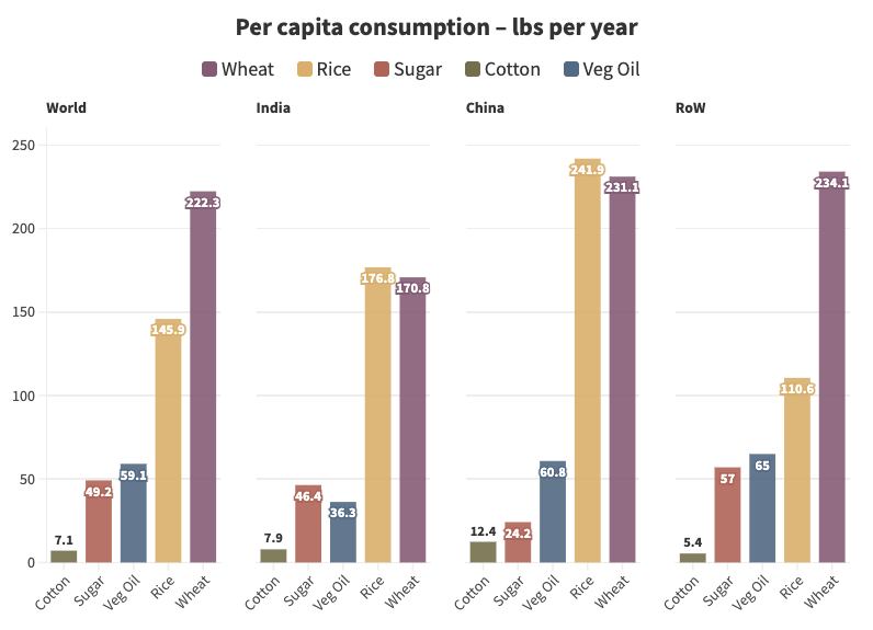 A look at their global trade balance in each product tells an interesting story. China has bolstered its domestic production with imports to the extent that the country consumes above world per capita levels in both grains, while still trailing world consumption levels in sugar. In contrast, India has pursued export-promotion schemes for all three products, even while consuming below world average levels in wheat and sugar. In rice, India does consume above world per capita averages but well below levels seen in other rice-producing nations like Thailand and Vietnam.