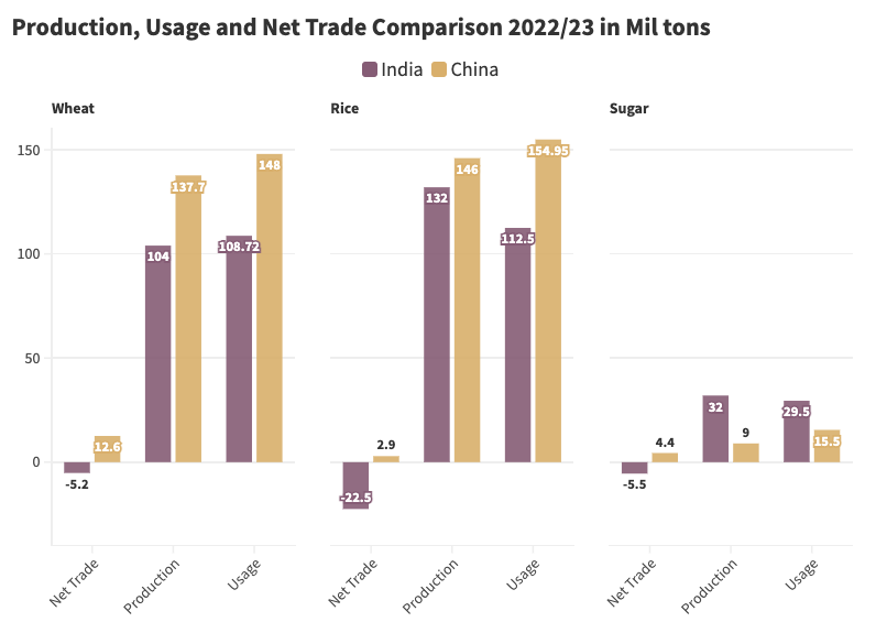 India, a WTO member since 1995, has been a less consistent buyer in the global commodity markets. The contrast between India and China’s approaches to trade can be illustrated in three key commodities – wheat, rice, and sugar. Both countries are major producers of each product. China and India rank first and second, respectively, in both global wheat and rice production and fifth and second in global sugar production.