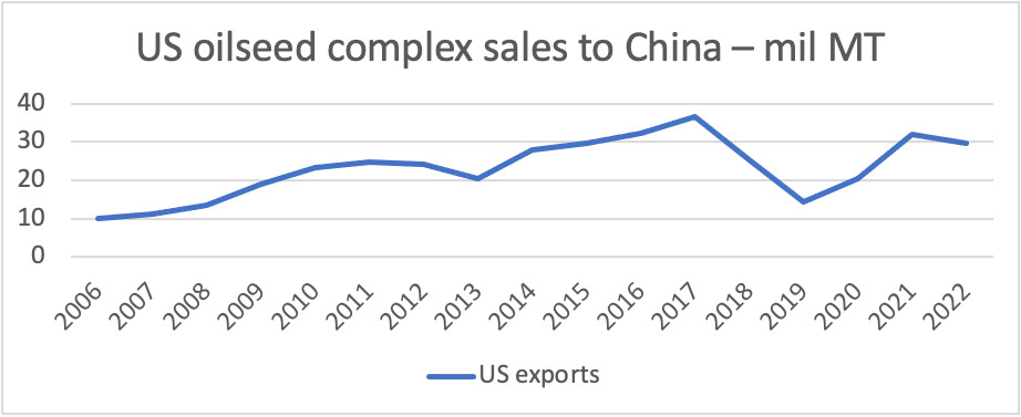 It is not a coincidence that the initial ramp-up in Chinese agricultural imports was marked by China’s entry into the World Trade Organization. Shortly after joining the WTO in 2001, China began to seek international trade (and eventually investment) partners to augment its domestic food production. Over subsequent years, trade in several key commodities was bolstered through the issuing of import licenses, WTO administered Tariff Rate Quotas (TRQ) and State Reserve purchasing to build strategic stockpiles. While not without controversy, the implementation of this multi-pronged approach greatly accelerated the flow of commodities into China.