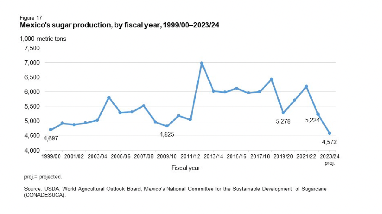 Mexico's sugar industry is facing significant challenges, with production expected to hit a 25-year low in 2023/24, according to the USDA's April report on sugar and sweetners. This decline is attributed to a combination of unfavorable weather conditions, rising input costs, and reduced harvested area.