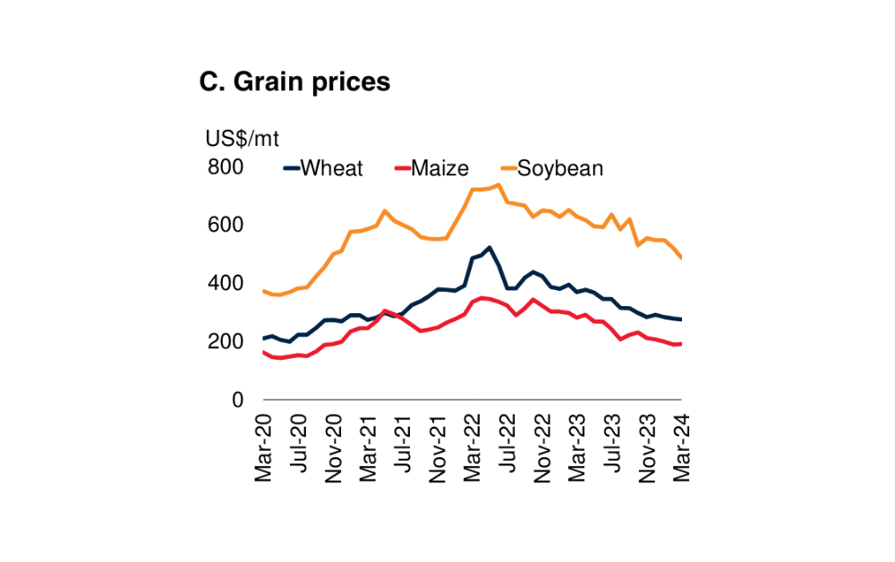 The report highlights recent trends such as falling maize and wheat prices due to increased production and exports from key regions. Wheat prices, in particular, are expected to experience a significant decline in 2024, primarily due to elevated global production and robust export competition.