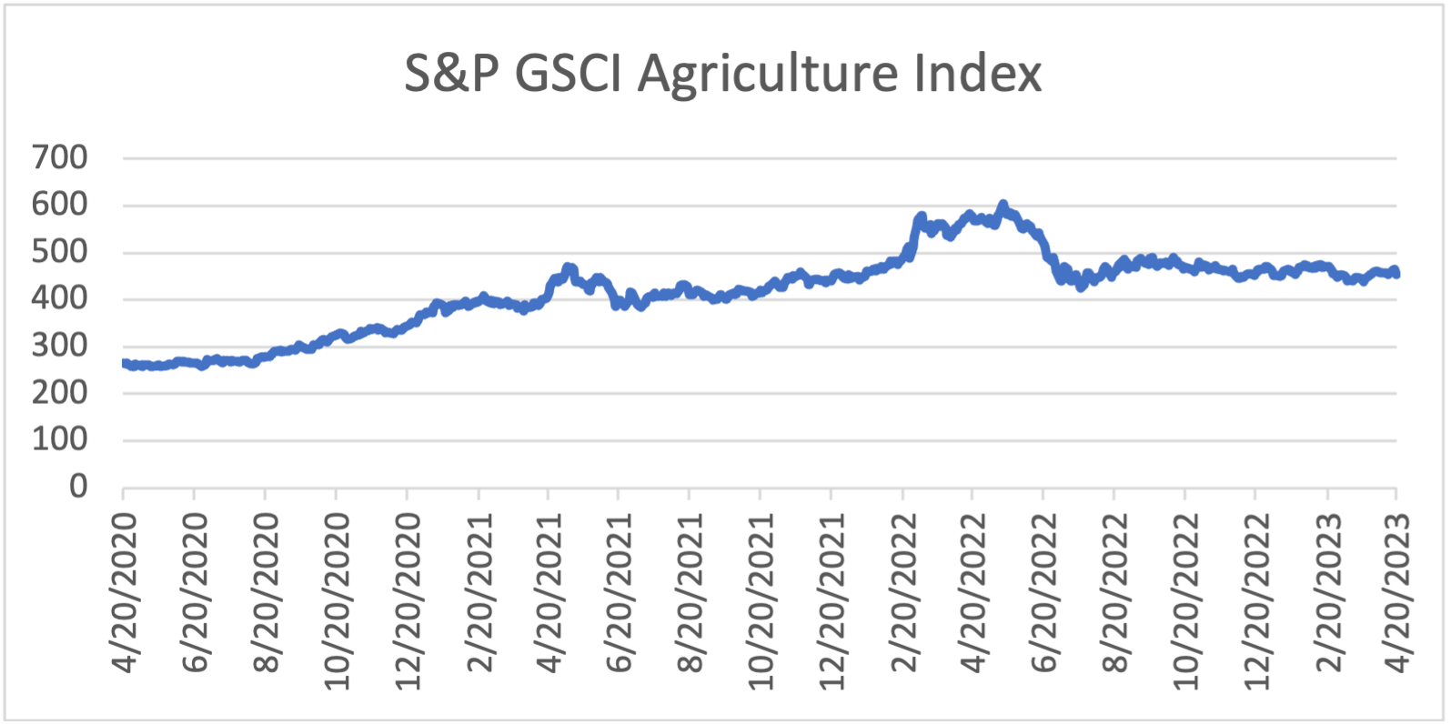 A similar pattern can be observed from a broader basket of agricultural commodities. The S&P GSCI Agriculture Index monitors the futures prices of all significant agricultural commodities such as grains, oilseeds, cotton, coffee, sugar, and others, and includes them in its benchmark index. As shown below, the prices of agricultural products across the board have also stabilized, either at or below the levels observed before the invasion.